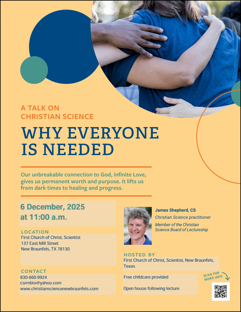 James Shepherd, practitioner of Christian Science healing and international speaker, will present his talk, “Why everyone is needed,” on Saturday, December 6th at 11:00 a.m.